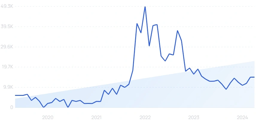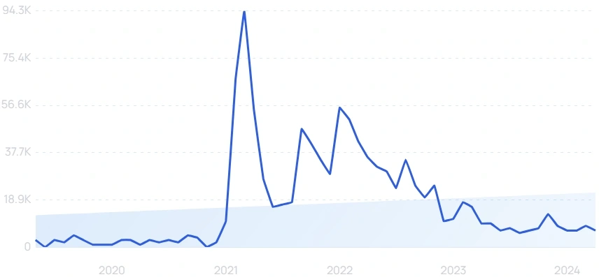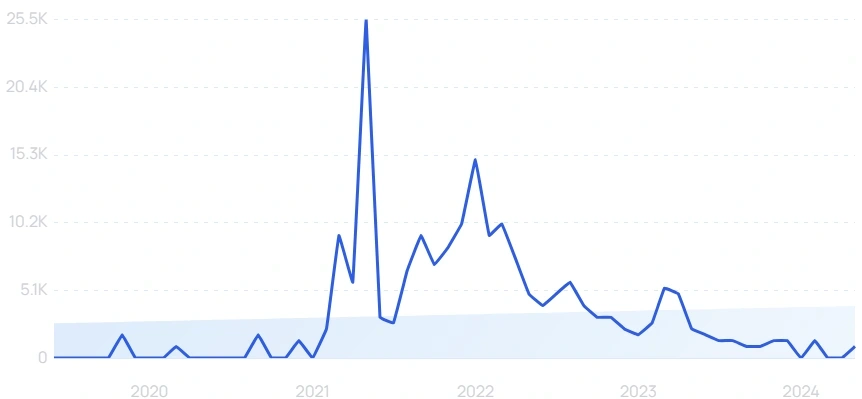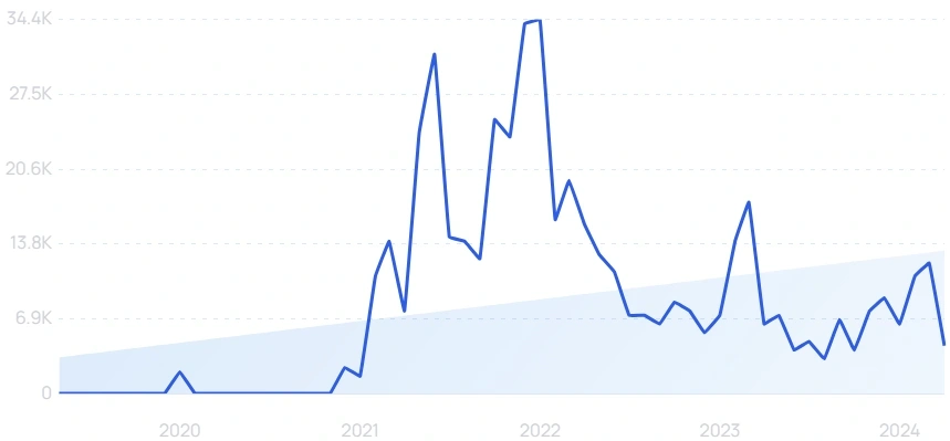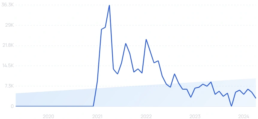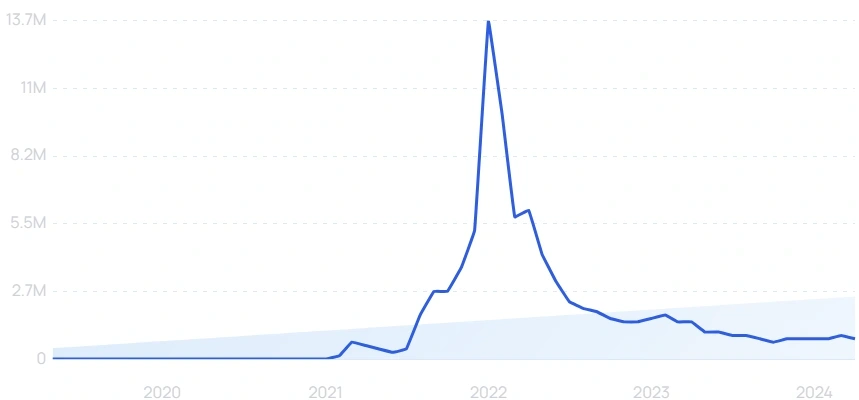 The NFT market cap grew significantly during 2021 and reached a market cap of over $40B. In 2024 however, the NFT market has shrunk and has a cap of about $9.6B.