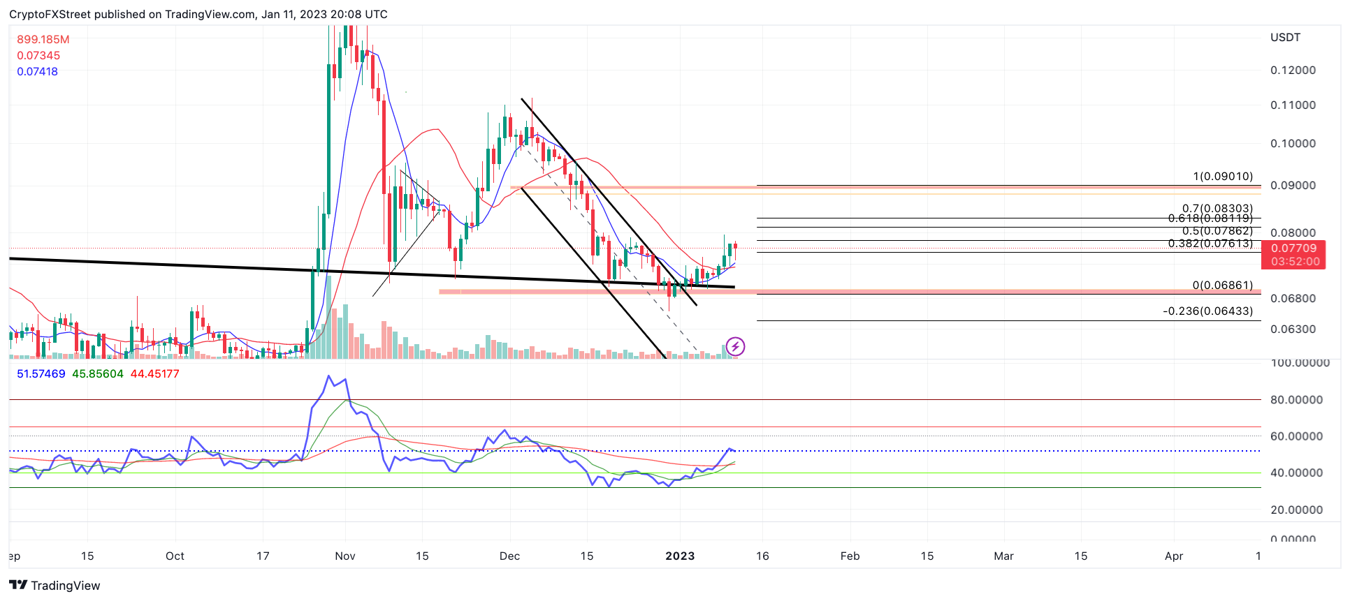 Dogecoin price has risen by 10% since January 1. DOGE nears strong resistance as bulls are at the midway point of the previous trading range. Invalidation of the bearish thesis could occur from daily settle above $0.083.