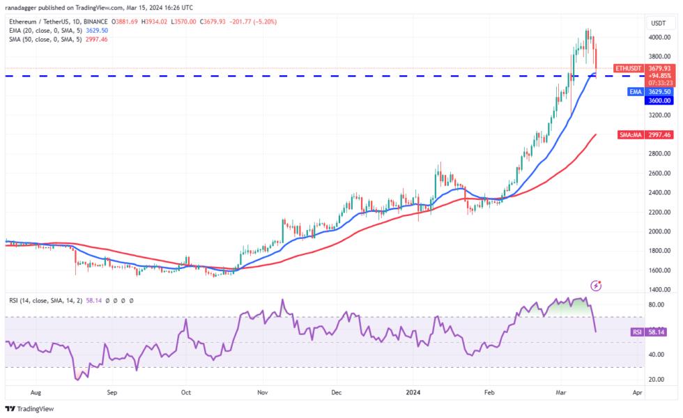 Ether’s (ETH) up move stalled near $4,000, tempting short-term traders to book profits. The long tail on the March 14 candlestick shows the bulls tried to flip the $3,600 level into support, but the fall on March 15 shows that the bears have kept up the pressure.