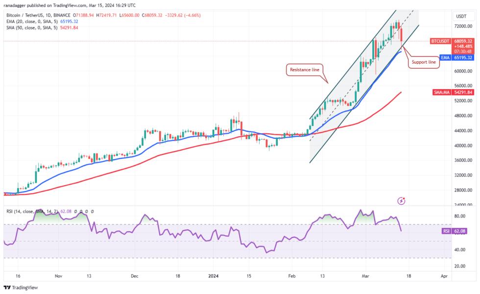 If the price plummets below the channel and the 20-day exponential moving average ($65,195), it will indicate the start of a corrective phase. The BTCUSDT pair could slide to $59,000 and thereafter to the 50-day simple moving average ($54,291).