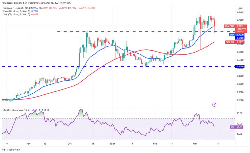 The bulls tried to kick Cardano (ADA) above the overhead resistance of $0.80 on March 14, but the long wick on the candlestick shows selling at higher levels.