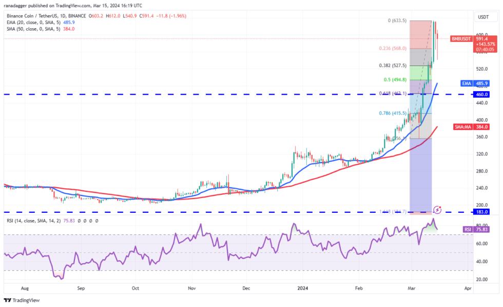Contrary to this assumption, if the price turns down from the current level and breaks below $527, it will signal that every rally is being sold into. The BNBUSDT pair may then tumble to the 20-day EMA ($485).