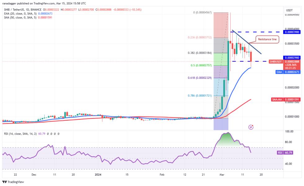 Shiba Inu (SHIB) tumbled below the $0.000029 support on March 15, indicating that the bears are trying to establish their supremacy.