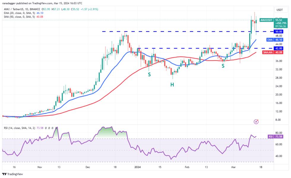 The bears tried to strengthen their position on March 15, but the long tail on the candlestick shows solid buying near the breakout level of $50. This suggests that the bulls are trying to flip $50 into support. If buyers shove the price above $59, the AVAXUSDT pair could resume its uptrend to $87.