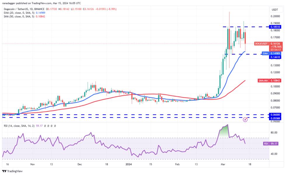 The price turned down sharply and reached the 20-day EMA ($0.15) on March 15. This suggests that the DOGEUSDT pair may remain stuck inside the range for a few more days. A break and close below $0.15 will tilt the advantage in favor of the bears. The pair could then tumble toward $0.12.