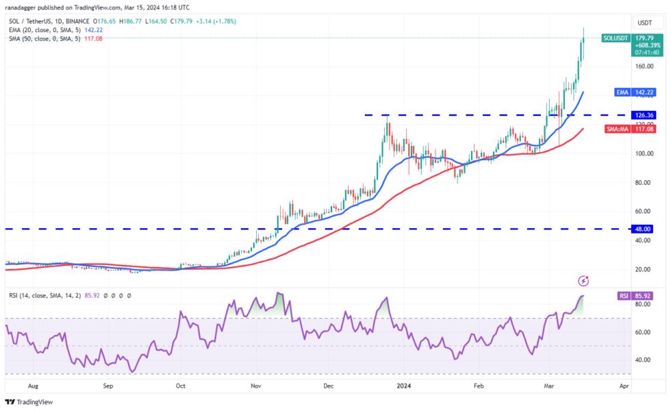 The up move has pushed the RSI deep into the overbought territory, suggesting that the SOLUSDT pair may have run up too fast in a short time. That could start a correction, which could pull the pair to the 20-day EMA ($142).