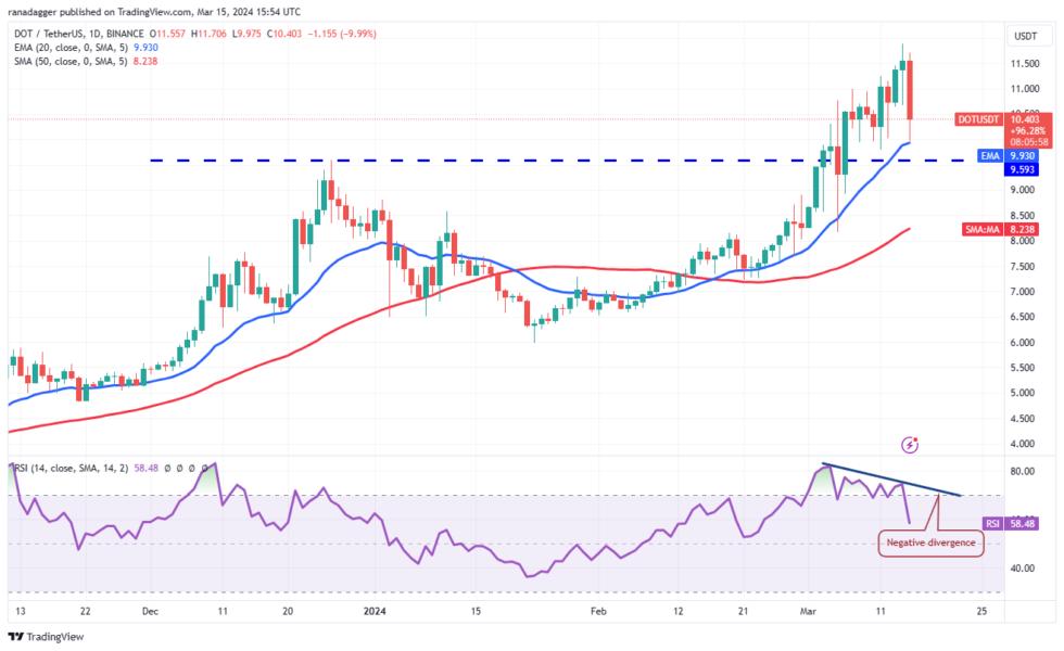 The negative divergence on the RSI suggests that the bullish momentum is waning. That increases the risk of a drop below the 20-day EMA ($9.93) and the breakout level of $9.59. If that happens, the DOTUSDT pair may start a deeper pullback. The pair could then decline to the 50-day SMA ($8.23).