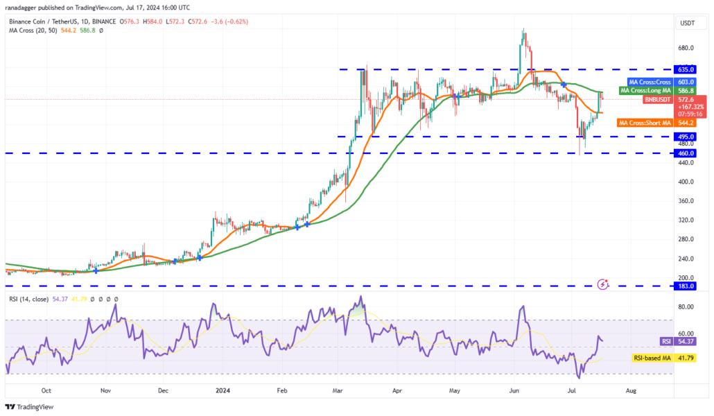 The bears are protecting the 50-day SMA ($586) in BNB (BNB), but they are struggling to pull the price below the 20-day SMA ($544). The long tail on the July 16 candlestick shows that the bulls are buying on minor dips.