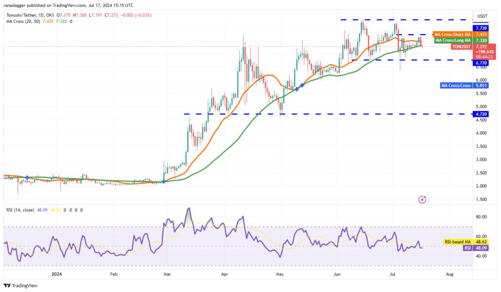 Toncoin (TON) rose above the 20-day SMA ($7.43) on July 15 but turned down from the $7.72 overhead resistance.