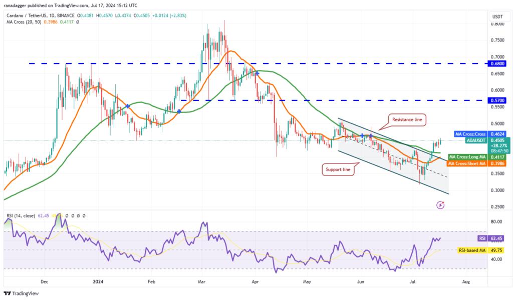 Contrary to this assumption, if the ADAUSDT pair turns down and breaks below the moving averages, it will indicate that the bears have not given up. That could result in a range-bound action between $0.32 and $0.45 for some time.