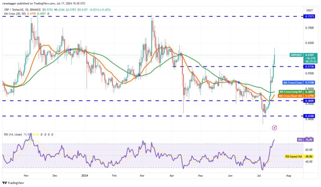The bears tried to stall the rally at $0.57, but the buyers bulldozed their way above the resistance on July 16. The moving averages are on the verge of a bullish crossover, and the RSI is in the overbought zone, indicating that bulls are in charge.
