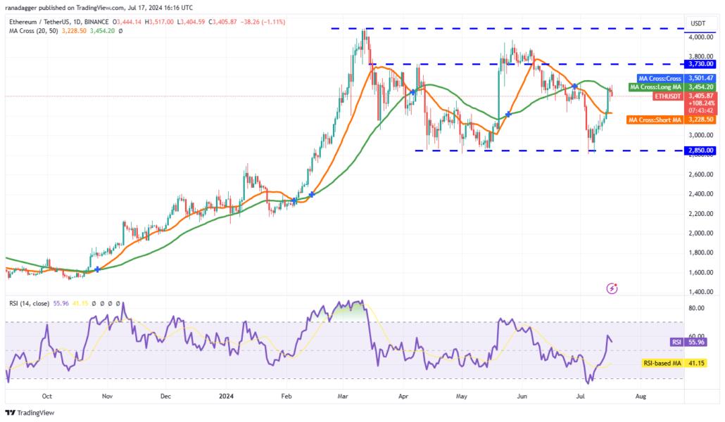 Ether (ETH) rallied to the 50-day SMA ($3,454) on July 15, indicating that the sideways movement between $2,850 and $4,094 remains intact.