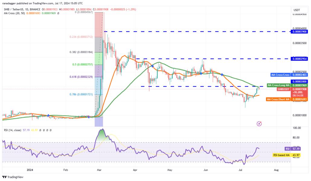 Shiba Inu (SHIB) reached the breakdown level of $0.000020 on July 16, where the bears are trying to halt the rally.