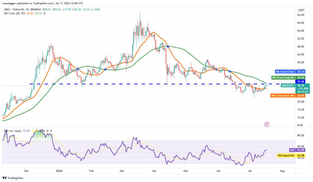 Avalanche (AVAX) has reached the overhead resistance of $29, where the bears are expected to mount a strong defense.