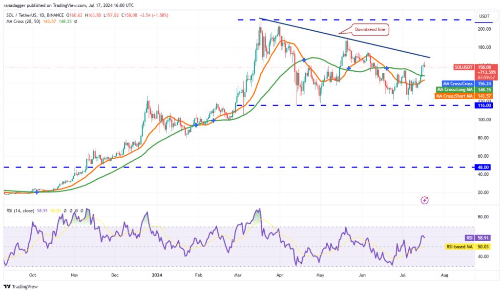 If the price turns down sharply from the downtrend line but bounces off the 20-day SMA ($143), it will suggest a change in sentiment from selling on rallies to buying on dips. That will increase the likelihood of a break above the downtrend line. If that happens, the SOLUSDT pair could rise to $189 and subsequently to $210.