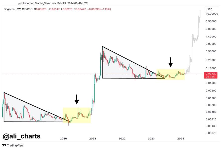 Martinez’s prediction is based on historical trends where such squeezes precede extremely bullish moves. Late last week, the analyst highlighted similarities between Dogecoin’s current behaviour and its actions in 2020. In that instance, DOGE broke out from a descending triangle, underwent a period of consolidation, and eventually soared by an impressive 28,770%.