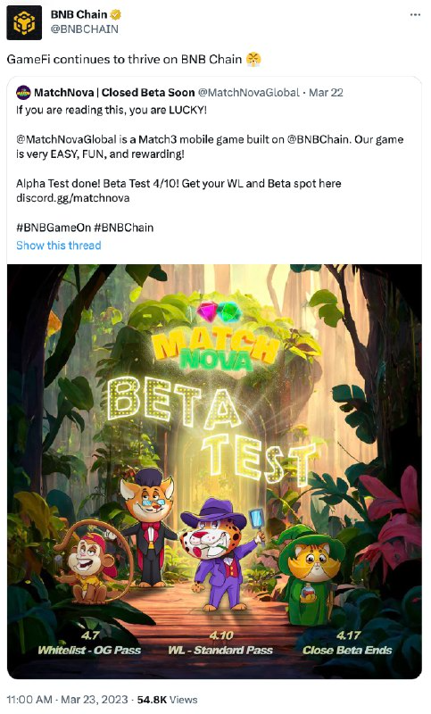 On March 23rd, BNB Chain’s official account retweeted MatchNova’s post regarding the Beta announcement, expressing its positive outlook towards MatchNova and the blockchain gaming industry.