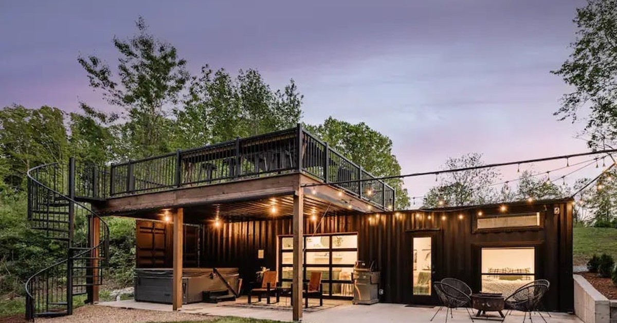 Each container is 8 feet by 40 feet, or about 320 square feet, and designed to feel like part of a secluded retreat. The first container has a hot tub and glass garage door for fluidity between the inside and outside. The recently opened second container has a small pond and waterfall feature under the home with a chair swing for relaxing evenings.