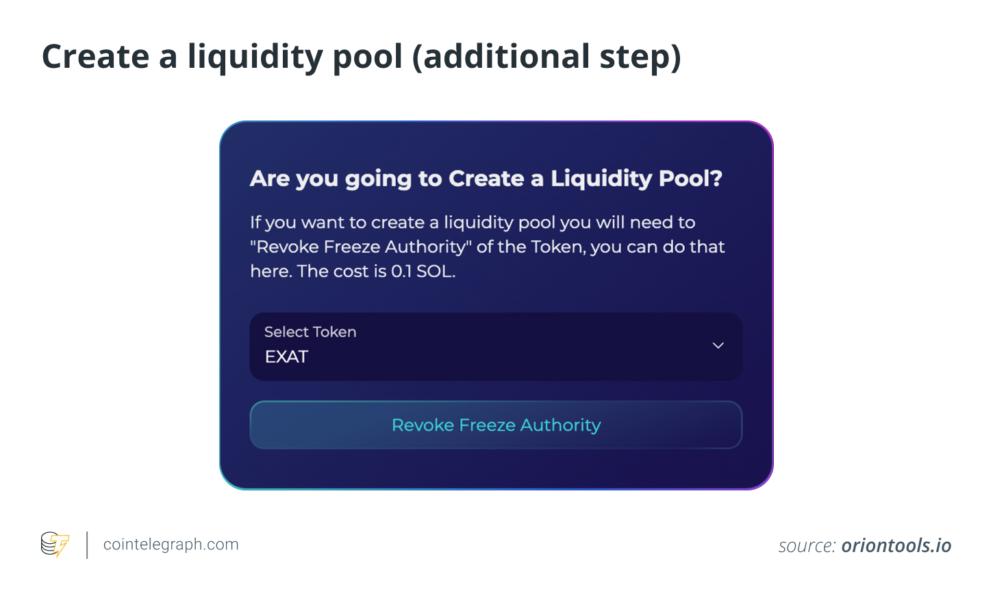 Now that the token is created, if a user wants to create a liquidity pool, they must use the “Create a Liquidity Pool” tool below the “Create Token” tool they just finished with. They can simply select the created token and click “Revoke Freeze Authority.” This will cost another transaction fee, but it allows the creator to retain control over their asset. However, liquidity pools are necessary for long-term projects, as they allow traders to acquire the token.