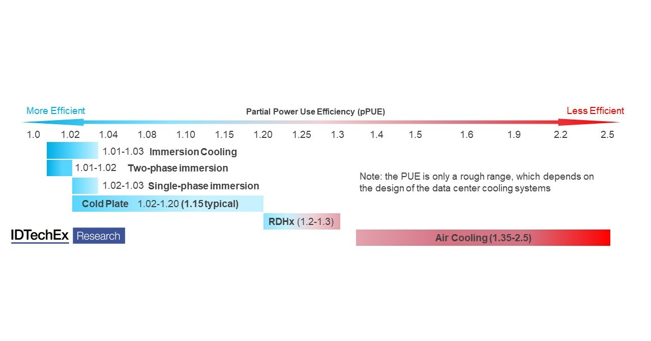 - Limited demand: While the power requirements of data centers have been increasing, IDTechEx believes that a combination of air cooling and direct-to-chip cooling can adequately meet cooling demands in the short to mid-term for the major applications. The urgent need for immersion cooling is not currently prevalent in the market.