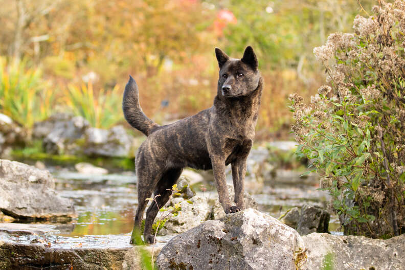 Kai Ken dogs are great swimmers, climbers and trackers, and their brindle coats (mottled black, brown and sometimes red) help them blend in with their surroundings.