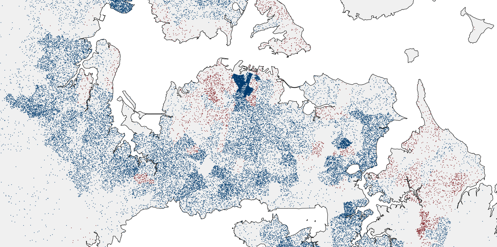 In the following decade, between 2011 and 2021 there was a larger increase of about 84,000 people aged 20-34 in Auckland. Note that the CBD is still dark blue – but over a smaller area, possibly reflecting a shift of more affordable apartments ‘uptown’. Some of the CBD-fringe areas and the lower North Shore stayed red as in the prior decade, although with fewer dots; perhaps because most people aged 20 to 34 had already been priced out of these areas.