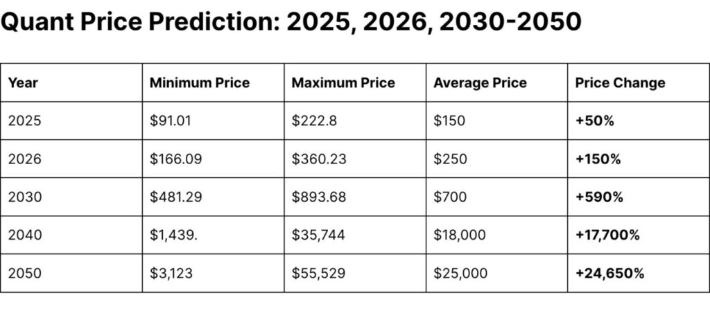 Quant’s price history shows significant fluctuations with sharp rises and deep corrections, reflecting volatile market conditions. By 2025, various analysts predict that the Quant price could reach between $91.01 and $222.80. These predictions are based on the adoption of Overledger’s technology and the growing use of blockchain in large enterprises.