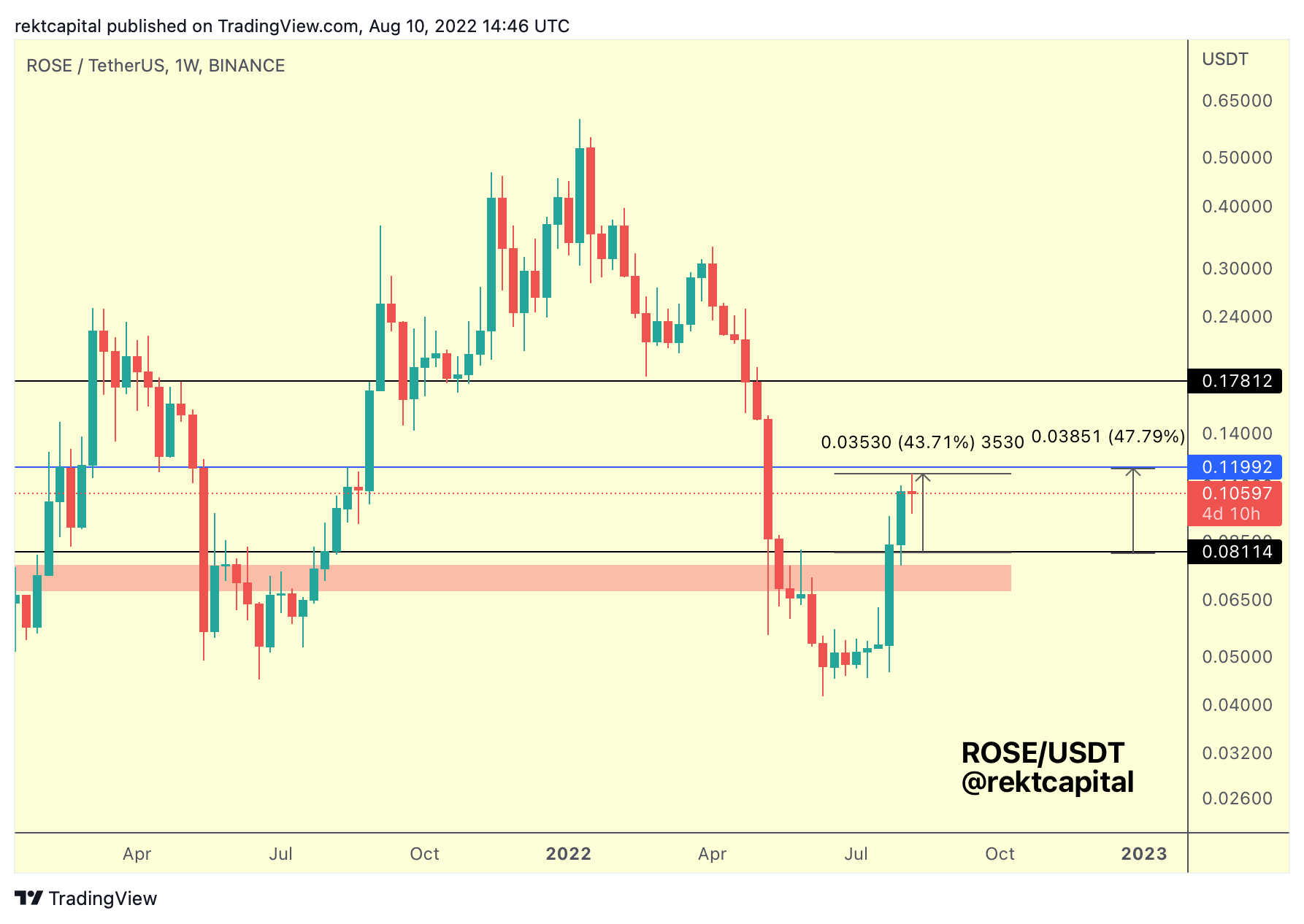At this stage, ROSE needs a Weekly Close above ~$0.12 (blue) to confirm further upside.”