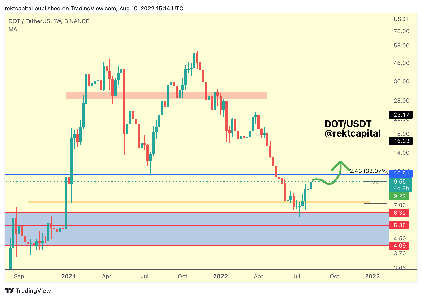 Currently, DOT is at $9.47, way over Rekt Capital’s target, and up 10% since yesterday.