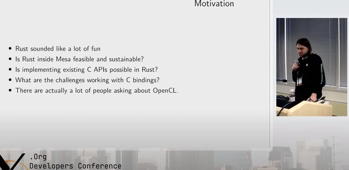 Merged last month into Mesa 22.3 was Rusticl as a Rust-written OpenCL implementation for Gallium3D that is beginning to work with the open-source Radeon Linux driver, the Intel “Iris” Gallium3D driver, and others. This is also the first Rust-written component within the Mesa code-base. Karol Herbst of Red Hat who has led Rusticl development presented this week in Minnesota on this promising cross-vendor OpenCL implementation that may also support SYCL in the future.