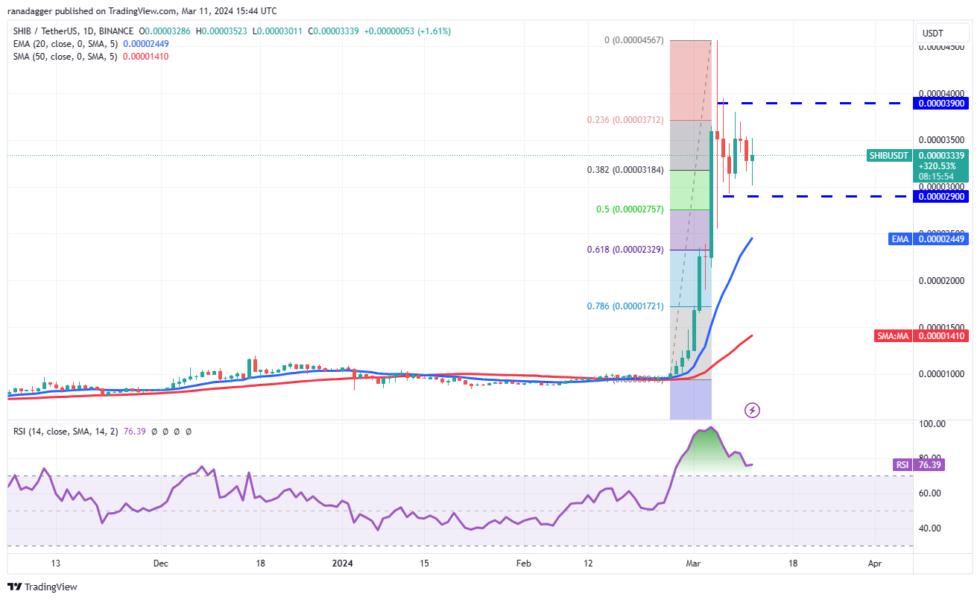 Shiba Inu (SHIB) has been consolidating inside a large range between $0.000029 and $0.000039 after the sharp rally,