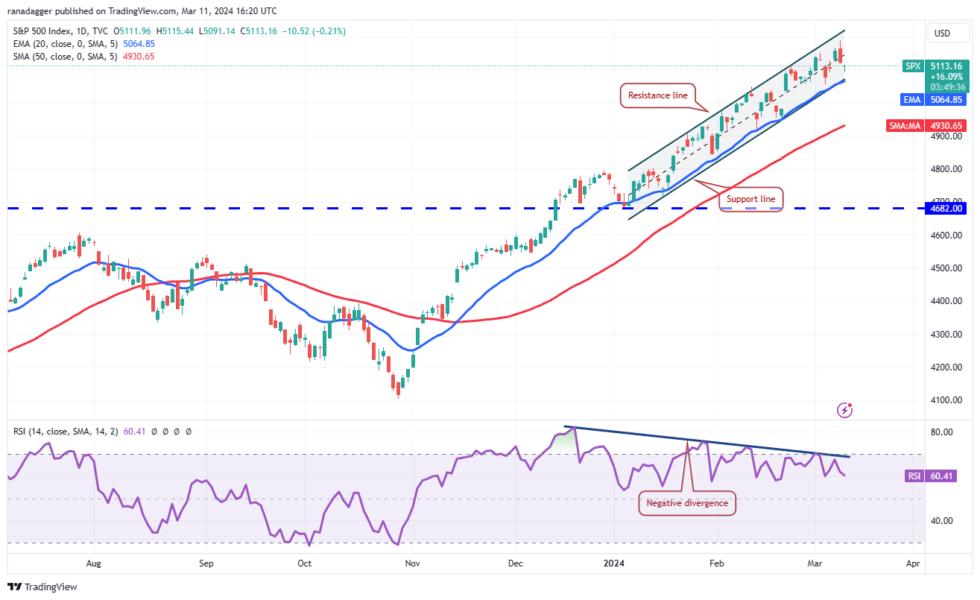 Although the upsloping moving averages indicate an advantage to buyers, the negative divergence on the relative strength index (RSI) cautions of a potential correction or consolidation in the near term. If bears sink the price below the channel, the selling could intensify, and the index may fall to the 50-day simple moving average (4,930).