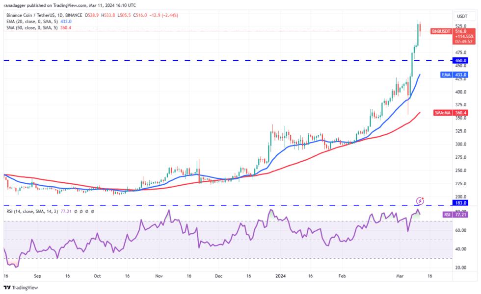 The BNBUSDT pair is likely to reach $560, which may act as a stiff resistance in the short term. If bulls do not give up much ground from $560, the uptrend may continue. The pair may then climb to $617.