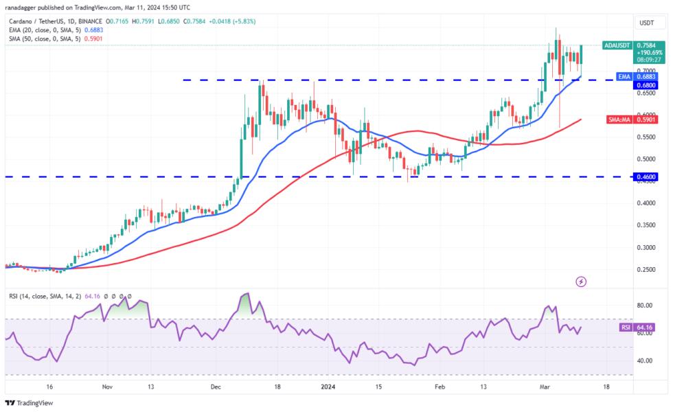 The upsloping 20-day EMA ($0.68) and the RSI in the positive territory suggest that the path of least resistance is to the upside. Buyers will try to propel the price to the March 4 high of $0.80. If this level is surmounted, the ADAUSDT pair could extend the rally to $0.90 and later to $1.25.