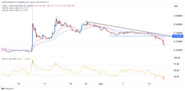 The daily chart shows that the XLM price has been in a strong bearish trend in the past few months. The token dropped below the important support at $0.1324, the lowest level on August 5th. It has also dropped below the descending trendline shown in black.