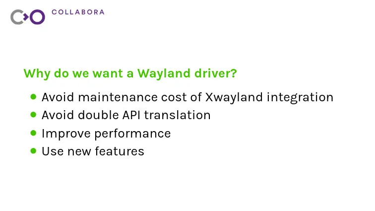 The hope with this Wine Wayland driver is to avoid the maintenance cost for those still relying on XWayland, avoiding double API transition, improving the performance (particularly for games), and making use of modern Linux desktop features with Wayland. The talk covered Wayland differences and how this driver is going about allowing Win32 software to ultimately work in a Wayland world. It turns out Google has been sponsoring some of this work for the Wine Wayland driver.