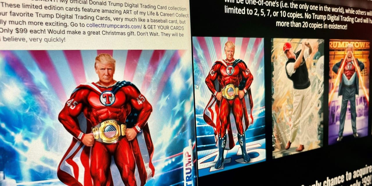 The collection of NFTs — called Trump Digital Trading Cards — featuring imagery of Trump in costumes such as cowboy, basketball player and a sort of superhero, saw its floor price, or the lowest price for collection items, up 22% over the past seven days to around $0.55 in ether, or $983 based on the current ether price, according to data from NFT marketplace OpenSea.