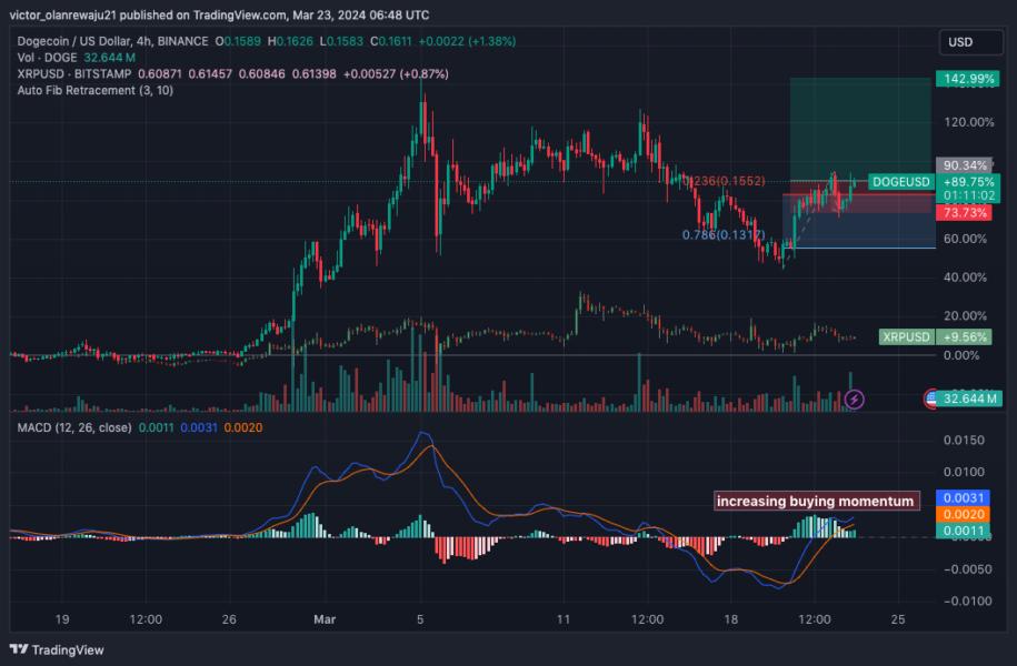 The resulting outcome from this trend could be a 27.92% increase. Should this breakout happen, the price of DOGE might hit $0.20. Furthermore, indications from the Moving Average Convergence Divergence (MACD) buttressed the bullish thesis.